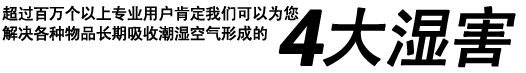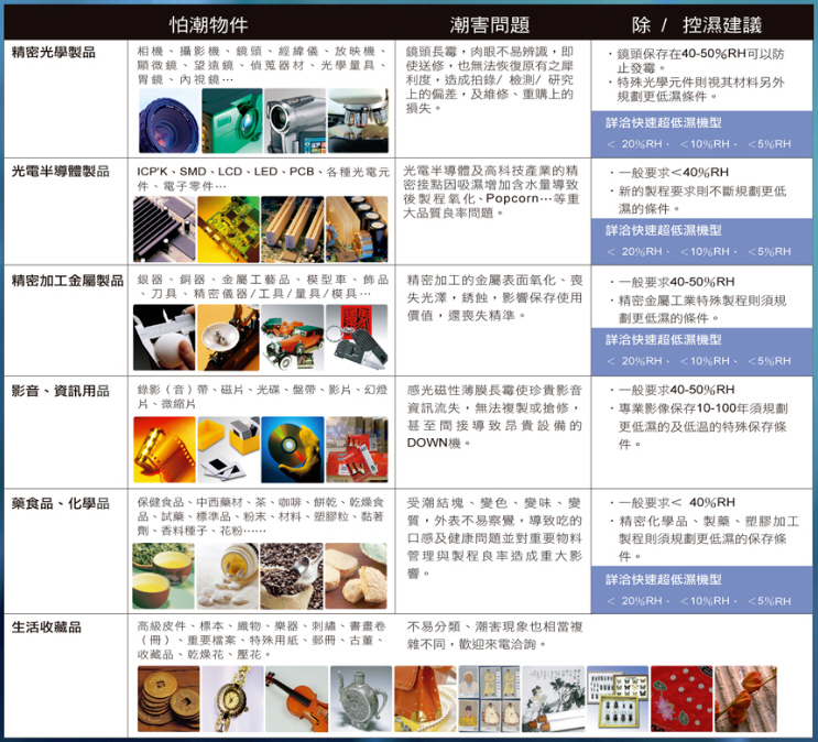 每个家庭 制造业、服务业、政府机关、学校…都会用到许多怕潮物件(如下文所列),这些对象长期吸收潮湿空气都会造成长霉、长水渍、氧化、丧失光泽、锈蚀、老化、劣化、接 触不良、 机件失灵(真)、Down机、卡纸、卡机、变质、变形、变味、变调…很多很多您从未注意到的潮湿损害问题,并造成维修、保养、整理、丢弃、 重购的不便、困扰与金钱损失,尤其是生活中的药食品受潮发霉,还会引起“吃”的健康问题。